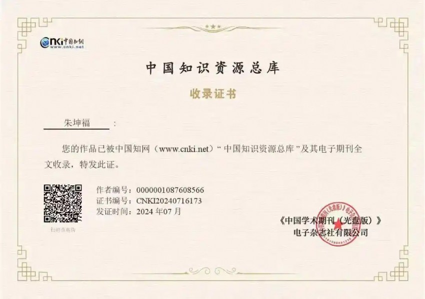科研積淀深厚:61 篇論文覆蓋多類核心期刊 據(jù) 中國知網(wǎng)《學(xué)者科研成果檢索報(bào)告》顯示,朱坤福先生累計(jì)發(fā)表論文共 61 篇,其中55 種期刊刊載的 60 篇期刊論文,總被引 310 次、總下載 33312 次,包含基金論文 7 篇、CSCD 論文 1 篇、中文核心期刊論文 18 篇,相關(guān)成果已獲中國知網(wǎng) “中國知識(shí)資源總庫” 官方收錄認(rèn)證。