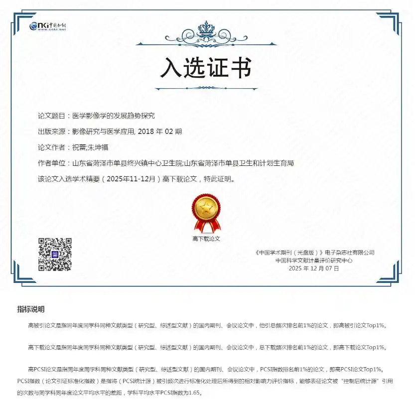 合作成果亮眼:兩篇論文躋身 “高下載 Top1%” 此次入選高下載論文的兩篇合作成果,聚焦醫(yī)療技術(shù)與臨床應(yīng)用領(lǐng)域:其中《醫(yī)學(xué)影像學(xué)的發(fā)展趨勢(shì)探究》刊載于《影像研究與醫(yī)學(xué)應(yīng)用》;《東貝遠(yuǎn)紅外磁療貼 (頸椎型) 治療頸型頸椎病療效觀察》發(fā)表在《臨床檢驗(yàn)雜志》。而根據(jù)證書指標(biāo)說明,“高下載論文” 是指同年度同學(xué)科同類型文獻(xiàn)中總下載頻次排名前 1% 的成果,此次兩篇論文的入選,也直接體現(xiàn)出它們?cè)谛袠I(yè)內(nèi)的高關(guān)注度與實(shí)用價(jià)值。