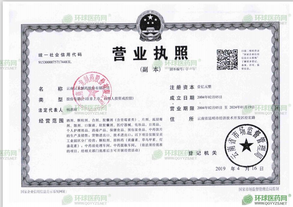 發(fā)證機關(guān): 云南省藥品監(jiān)督管理局