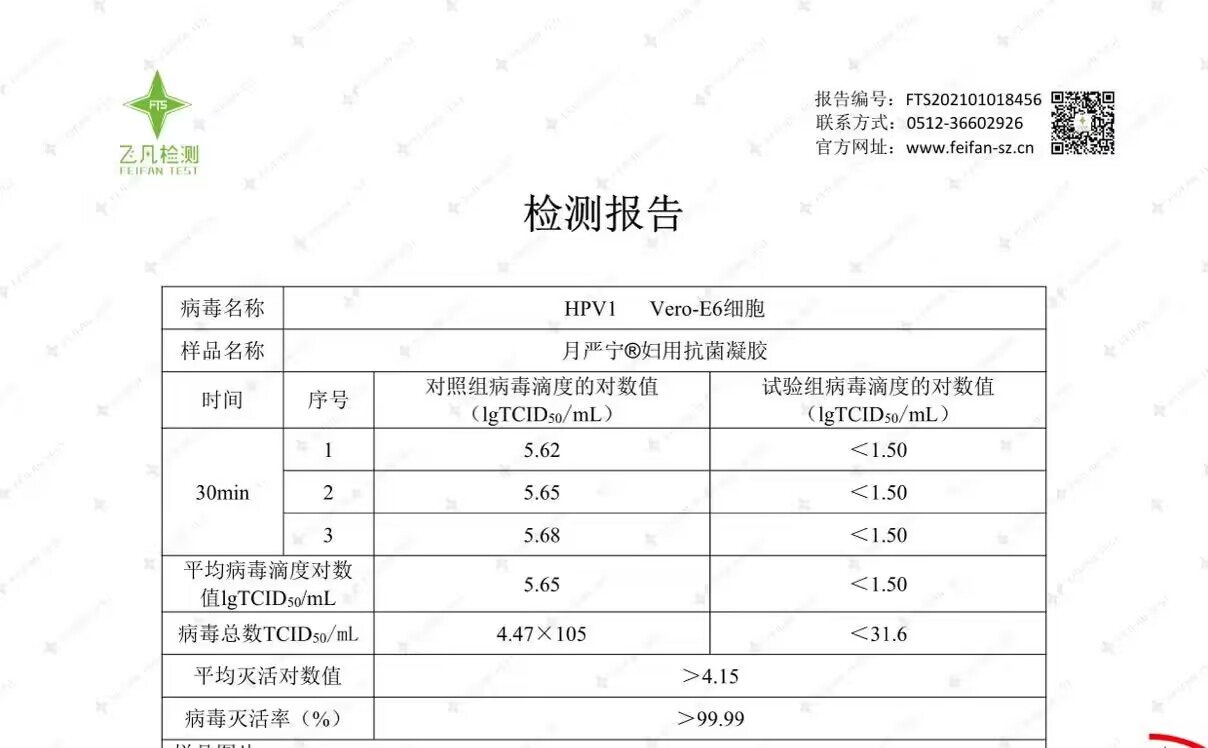 并且,月嚴(yán)寧婦用抗菌凝膠定位HPV市場(chǎng),在實(shí)驗(yàn)條件下,對(duì)人乳頭瘤病毒(HPV1)的滅活率>99.99%。