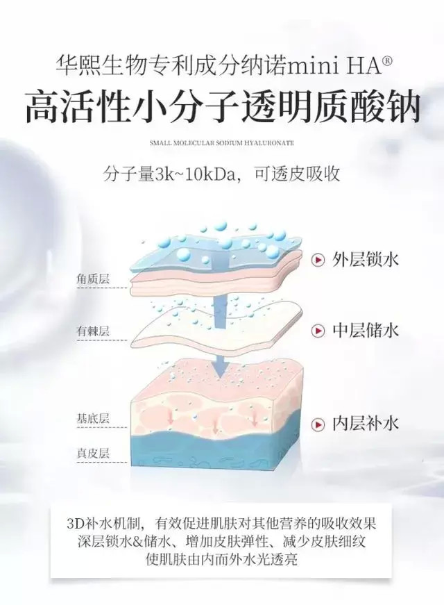 普通身體乳的滋潤只停留在皮膚表面而到達(dá)不了肌底,而古草凝萃人參維E身體乳在這方面出手十分穩(wěn)準(zhǔn),在滿足身體乳滋潤度的核心需求上直接放出了大招 ——高活性小分子透明質(zhì)酸鈉,它是由華熙生物實(shí)驗(yàn)室主導(dǎo)研發(fā)的專利成分納諾miniHA,分子量僅3k~10kDa,可透皮吸收,復(fù)配天然植物油脂,實(shí)現(xiàn)使肌膚由內(nèi)而外水光透亮。