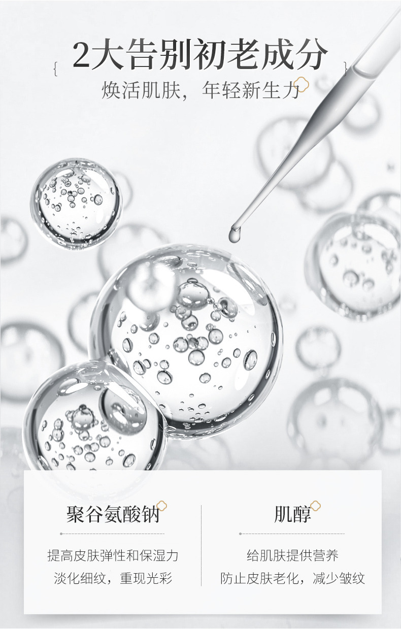 1、聚谷氨酸鈉X肌醇:給肌膚提供足夠的營養(yǎng),可防止細胞老化、淡化肌膚細紋和皺紋;雙重抵御初老。從而由內(nèi)而外改善肌膚干紋皺紋。