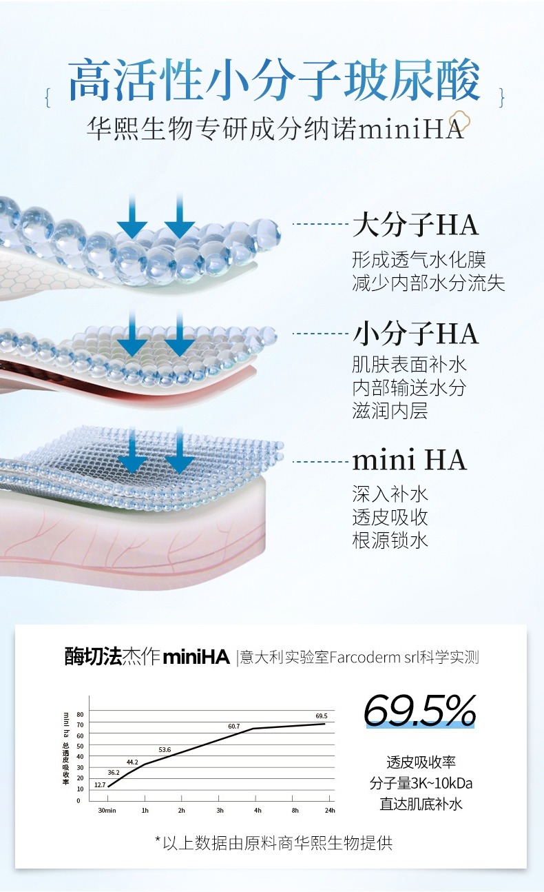 它屬華熙生物專研成分納諾miniHA,其中大分子HA能形成透氣水化膜,減少內(nèi)部水分流失;小分子HA可在肌膚表面補(bǔ)水同時(shí)在肌膚內(nèi)部輸送水分;miniHA能直達(dá)肌底層深入補(bǔ)水。可在皮膚上構(gòu)建立體網(wǎng)狀儲(chǔ)水海綿層,精準(zhǔn)定位皮膚的不同層次,外層補(bǔ)水,內(nèi)層鎖水,層層保濕,層層修護(hù)。更重要的是運(yùn)用了國(guó)際先進(jìn)的酶切法,能深入肌底層修復(fù)細(xì)胞,達(dá)到真正修復(fù)的效果。