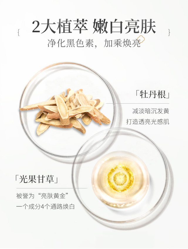 2、兩大植萃成分---嫩白亮膚:其中牡丹根能減淡暗沉發(fā)黃肌膚,打造透亮光感肌,而光果甘草能促進(jìn)膠原蛋白新生,使得肌膚重新恢復(fù)細(xì)膩狀態(tài),被譽(yù)為“亮膚黃精”!