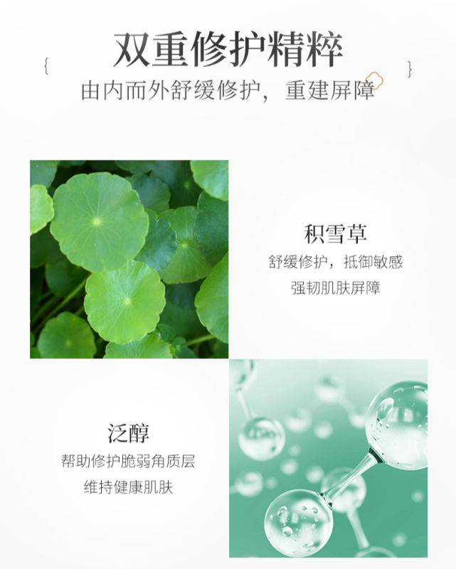 3、雙重修護(hù)精粹成分---舒緩修護(hù)、重建屏障:其中積雪草能起到舒緩修護(hù),抵御敏感,強(qiáng)韌肌膚屏障的作用,而泛醇能幫助修護(hù)脆弱角質(zhì)層,維持肌膚的健康!