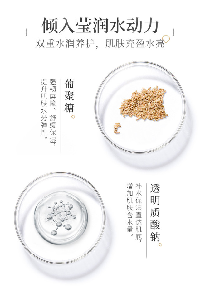 4、雙重水潤(rùn)養(yǎng)護(hù)成分---肌膚充盈水亮:其中葡聚糖能強(qiáng)韌肌膚屏障,舒緩保濕,有效提升肌膚水分及彈性;而透明質(zhì)酸鈉則可以直達(dá)肌底層補(bǔ)水,達(dá)到外層補(bǔ)水、內(nèi)層鎖水的功效。