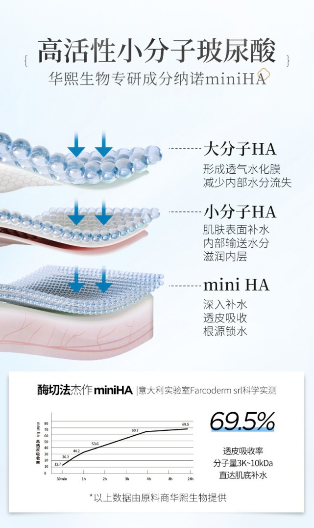 屬華熙生物專研成分納諾miniHA,其中大分子HA能形成透氣水化膜,減少內(nèi)部水分流失;小分子HA可在肌膚表面補(bǔ)水同時(shí)在肌膚內(nèi)部輸送水分;miniHA能直達(dá)肌底層深入補(bǔ)水。更重要的是運(yùn)用了國際先進(jìn)的酶切法,能深入肌底層修復(fù)細(xì)胞,達(dá)到真正修復(fù)的效果。