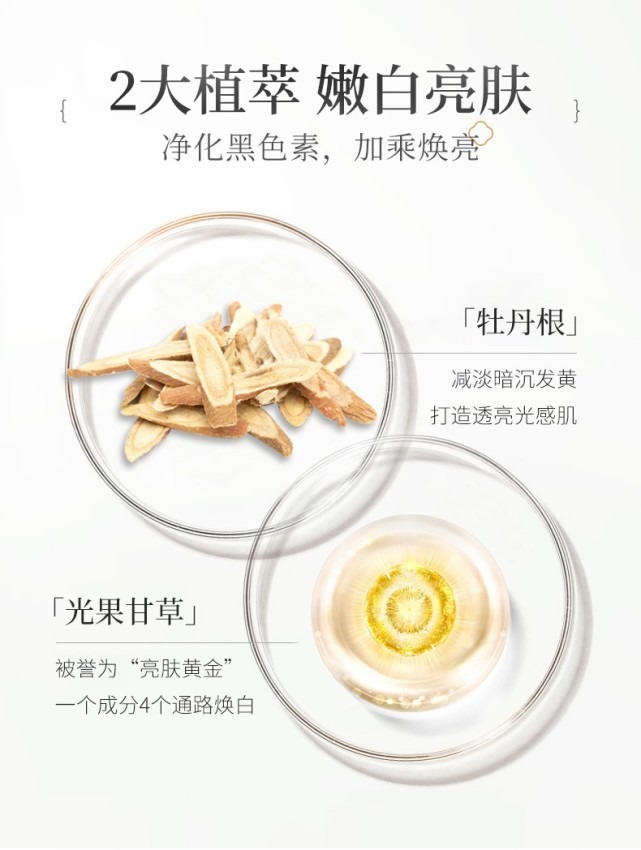 3、兩大植萃成分:其中牡丹根能減淡暗沉發(fā)黃肌膚,打造透亮光感肌,而光果甘草能促進(jìn)膠原蛋白新生,使得肌膚重新恢復(fù)細(xì)膩狀態(tài),被譽(yù)為“亮膚黃精”!