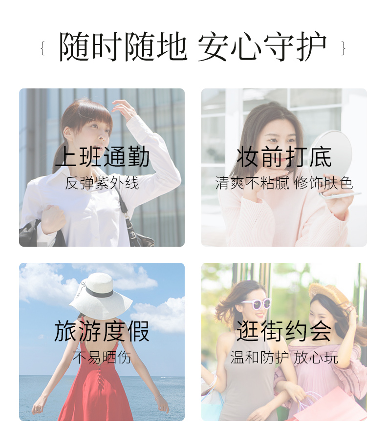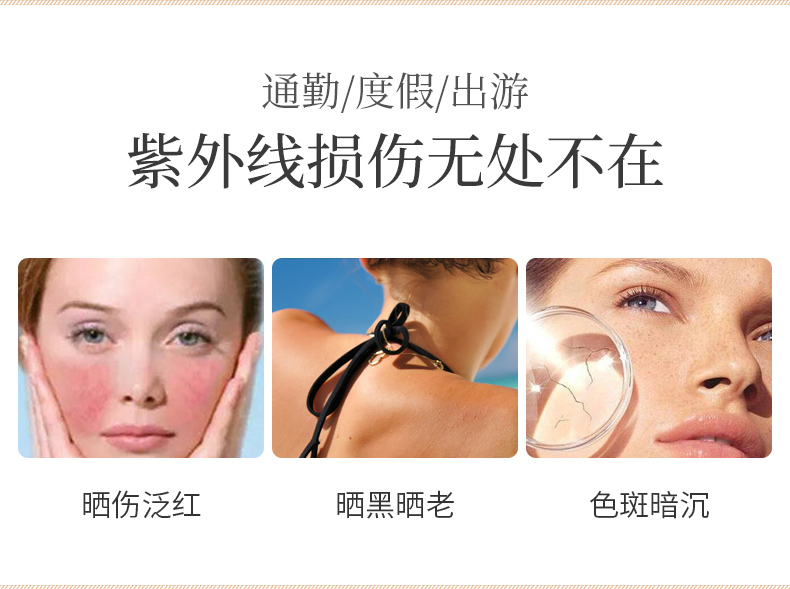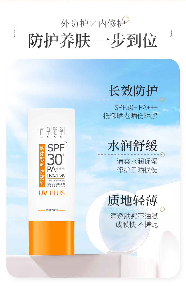 春季里陽光明媚,看似溫柔的太陽總能讓人卸下防備,然而,春天紫外線中的UVA快速增長,當(dāng)你卸下防備,UVA常常能“趁虛而入”造成肌膚光老化,從而導(dǎo)致色斑、肌膚不均等問題.....這時可不能少了古草凝萃防曬乳,它采用復(fù)合型防護(hù)體系,應(yīng)對不同波長紫外線,兼具隔離作用,防護(hù)肌膚不受外界侵害,同時創(chuàng)新的成膜科技,應(yīng)對日常出汗、出油等難題,給肌膚全天的防護(hù)。
