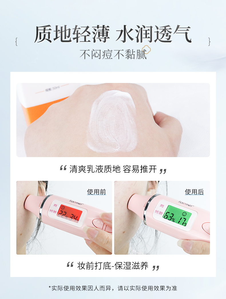 古草凝萃防曬乳質(zhì)地輕薄、水潤透氣、帶來不黏膩的清爽肌膚使用感,使用后不悶痘不黏膩。