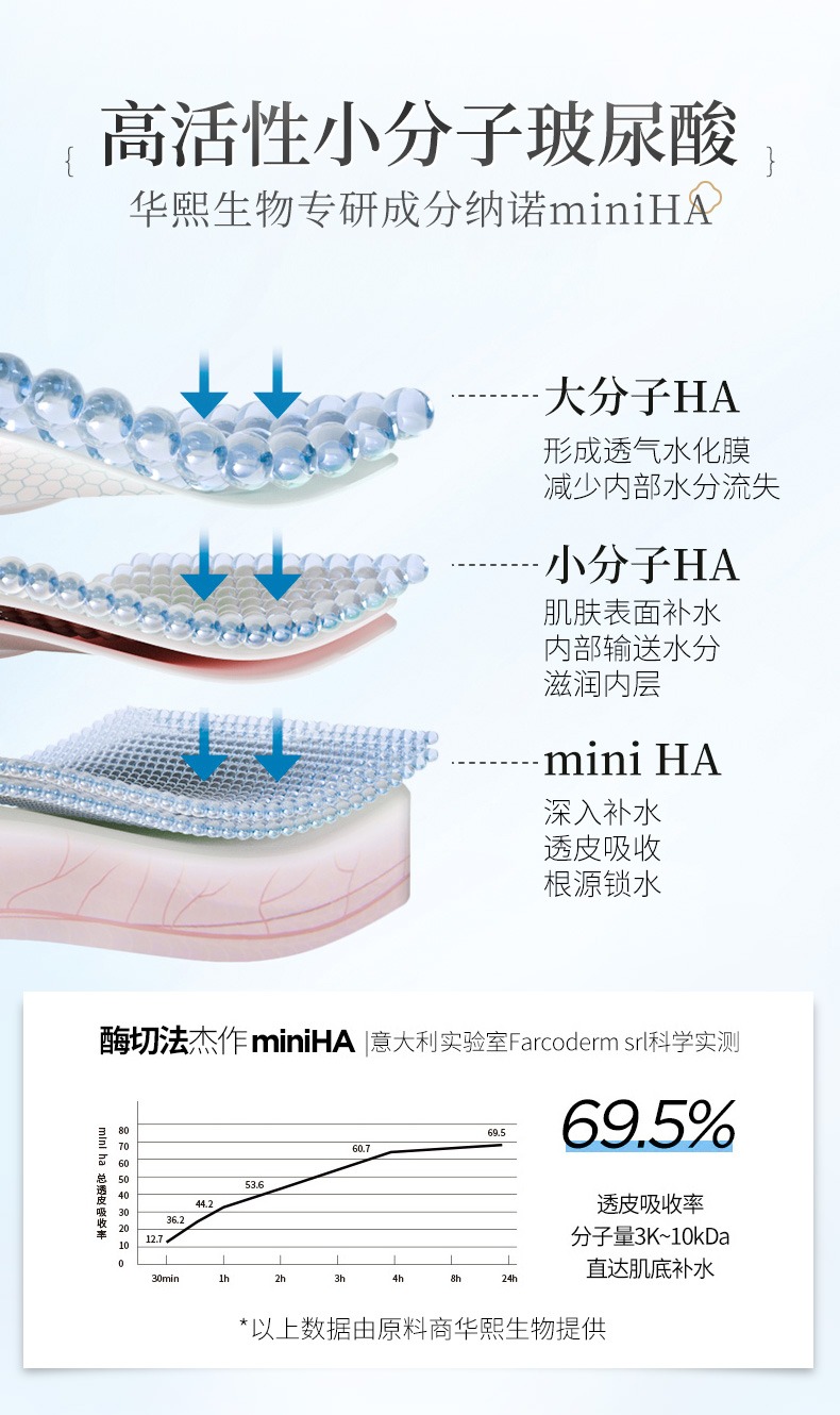 3、添加有高活性小分子玻尿酸(透明質(zhì)酸),是屬于華熙生物專(zhuān)研成分納諾miniHA,可在皮膚上構(gòu)建立體網(wǎng)狀儲(chǔ)水海綿層,精準(zhǔn)定位皮膚的不同層次,外層補(bǔ)水,內(nèi)層鎖水,層層保濕,層層修護(hù)。