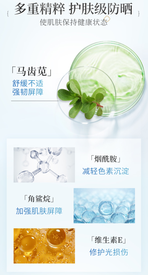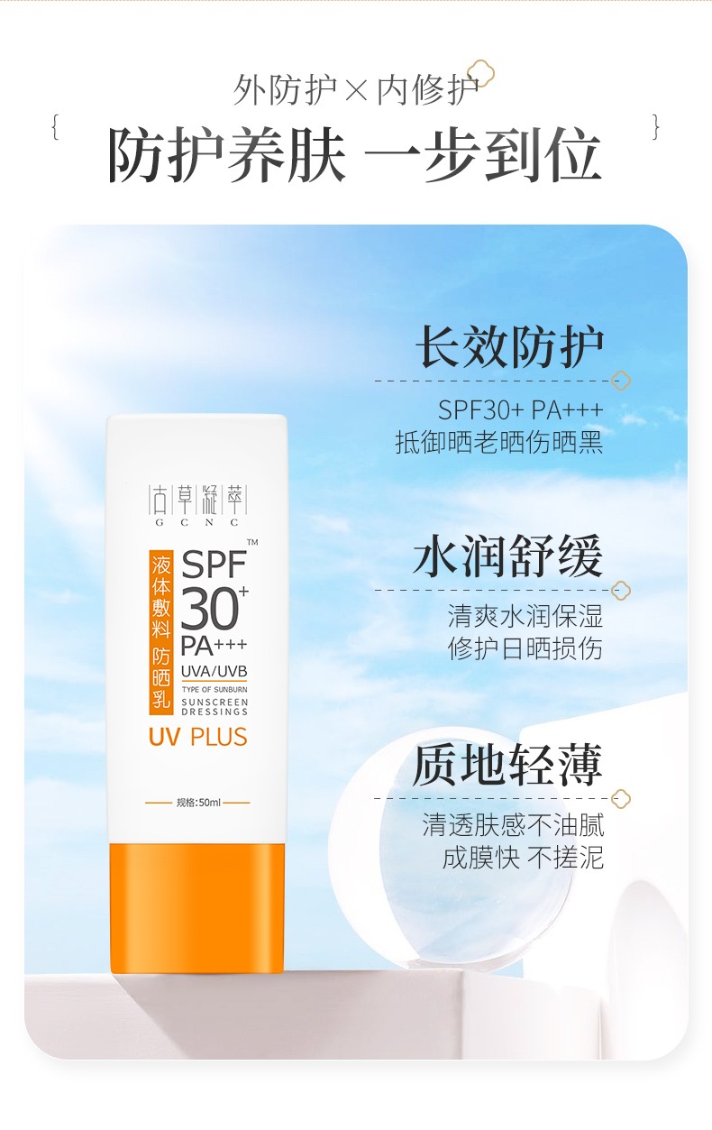 古草凝萃防曬乳質(zhì)地輕薄、細(xì)膩水乳質(zhì)地,水潤(rùn)透氣、帶來很清爽的肌膚使用感,使用后不悶痘不黏膩。擦在肌膚上很容易推開,不泛白,能有效控制油脂分泌,幫助調(diào)節(jié)肌膚的水油平衡,增加皮膚含水量,減少粉痕和融妝現(xiàn)象。