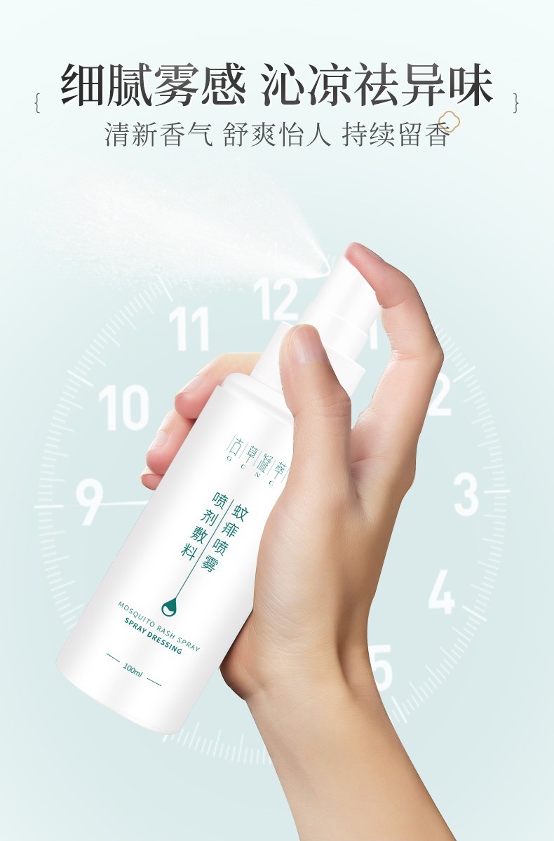 古草凝萃蚊痱噴霧采用噴霧式設(shè)計,噴出來的噴霧很細膩,膚感溫和,清爽不粘膩,可以均勻的灑落在皮膚或者衣服上面,不會四處飛散,可以避免被吸入,很適合小朋友使用,不會出現(xiàn)斑點的樣子,也不會出現(xiàn)濕一片干一片的!在炎熱的夏季睡前噴一下,蚊蟲不敢近身,讓你在夏日盡享好睡眠!