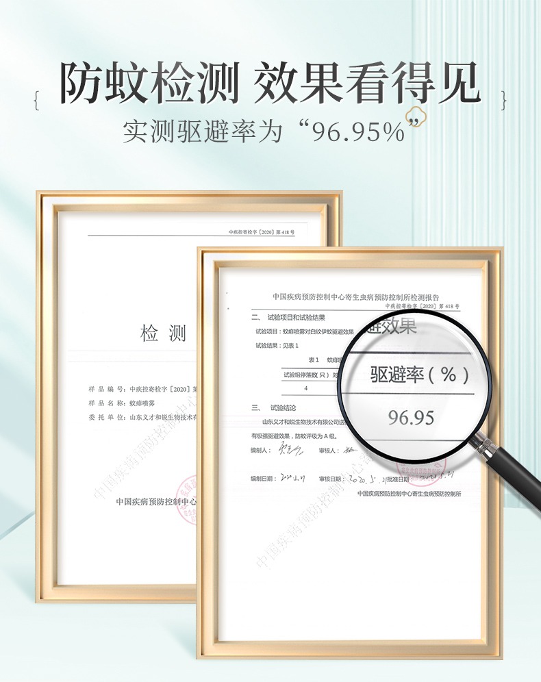 更重要的,古草凝萃蚊痱噴霧具備權(quán)威部門---中國疾病預防控制中心的檢測報告!實測驅(qū)避率高達96.95%!