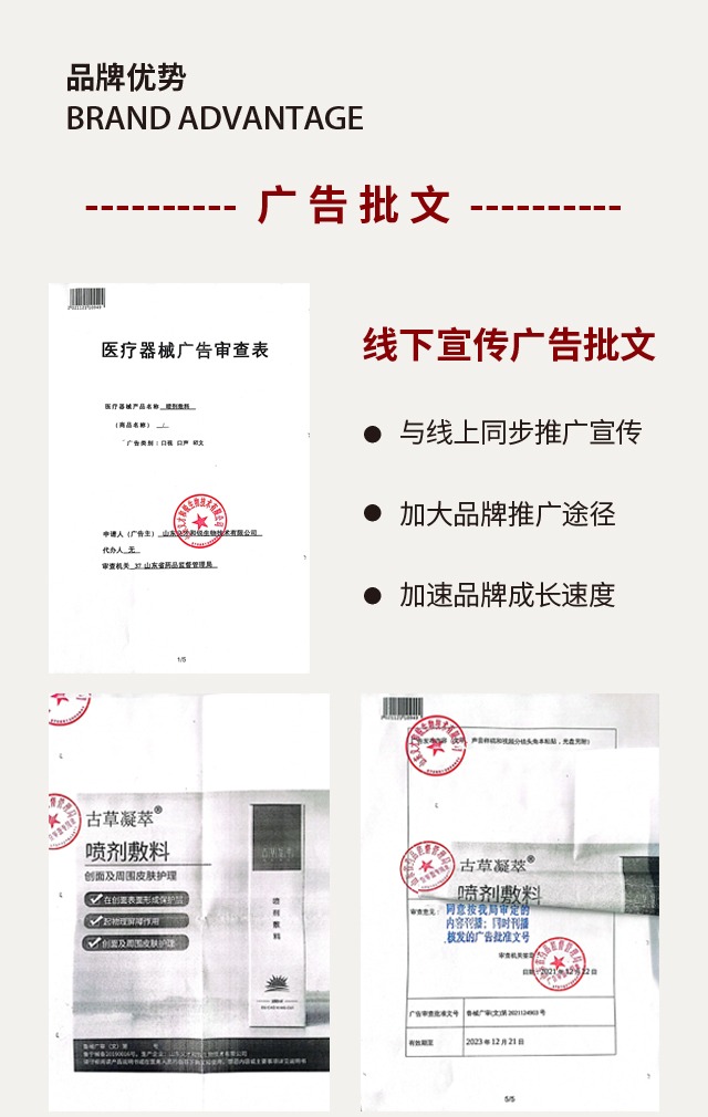 古草凝萃的線下宣傳廣告批文與線上同步推廣宣傳,并加大品牌推廣途徑;從而加速品牌成長速度!