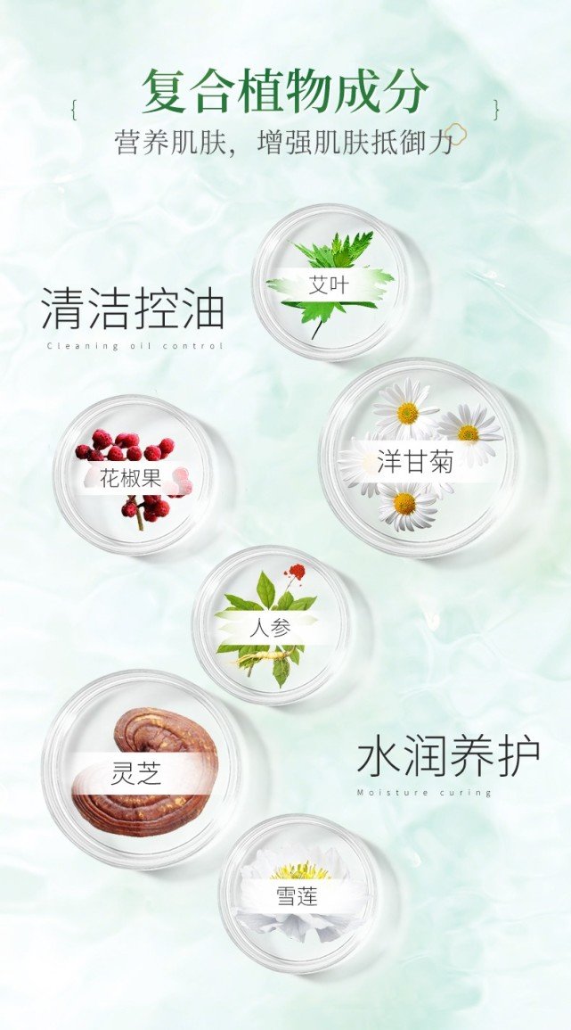 復合多重植物成分,其中包括有艾葉、洋甘菊,花椒果,人參,靈芝、雪蓮,能營養(yǎng)肌膚,增強肌膚抵御力。