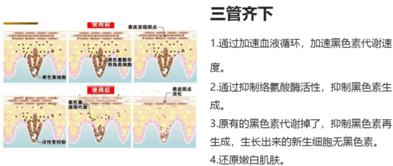 抑制黑色素沉著、抗炎等方面也有很好的療效;減少已經(jīng)生成、沉淀的黑色素,阻隔其向表層細(xì)胞的轉(zhuǎn)移,加速細(xì)胞新陳代謝、加快黑色素角質(zhì)細(xì)胞脫落等。