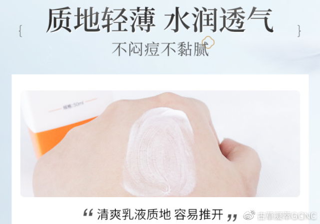 古草凝萃防曬乳質地輕薄、水潤透氣、帶來不黏膩的清爽肌膚使用感,使用后不悶痘不黏膩。
