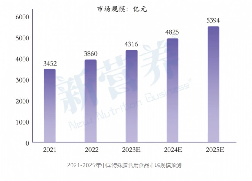 近幾年,在“健康中國”戰(zhàn)略背景下,中國特殊膳食用食品行業(yè)發(fā)展環(huán)境日趨向好,特膳食品市場規(guī)模在持續(xù)增長。一方面,中國人均收入水平持續(xù)提升,消費者對特殊膳食用食品消費能力增強;另一方面,消費者健康意識提高,對特殊膳食用食品認知程度提高。據(jù)新營養(yǎng)通過公開數(shù)據(jù)分析,2021年中國特殊膳食用食品市場規(guī)模為3452億元,2022年達到了3860億元,增長率為11.8%,2023年有望達到4316億元,預計2025年將達到5394億元。