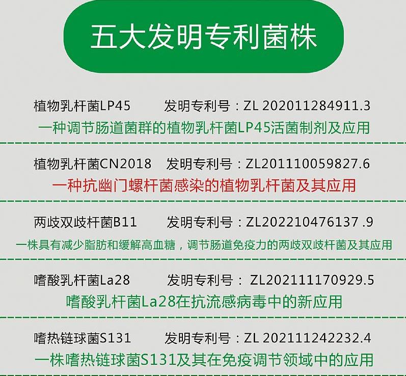 ②專利菌種,添加五大發(fā)明專利菌株,尤其是可抗幽門螺旋桿菌專利菌株。專利號(hào):Zl 201110059827.6,一種抗幽門螺桿菌感染的植物乳桿菌及其應(yīng)用。