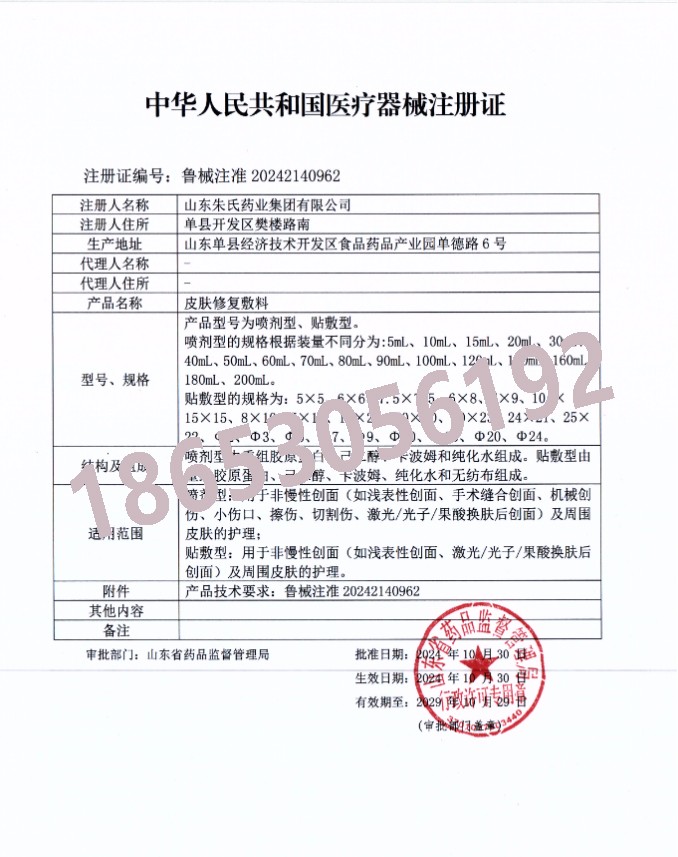 在皮膚醫(yī)療領(lǐng)域持續(xù)創(chuàng)新的山東朱氏藥業(yè)集團(tuán)近日再傳捷報(bào),其自主研發(fā)的新型皮膚修復(fù)敷料正式獲得國(guó)家藥品監(jiān)督管理局頒發(fā)的醫(yī)療器械注冊(cè)證(注冊(cè)證編號(hào):魯械注準(zhǔn)2023xxxxxx)。這標(biāo)志著企業(yè)在皮膚修復(fù)領(lǐng)域的技術(shù)實(shí)力再獲國(guó)家權(quán)威認(rèn)可,為臨床皮膚損傷修復(fù)提供了更專業(yè)的解決方案。