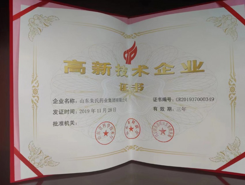 山東朱氏藥業(yè)集團(tuán)榮膺 “國家級高新技術(shù)企業(yè)” 與 “專精特新” 雙項(xiàng)認(rèn)定,這是對其創(chuàng)新實(shí)力和企業(yè)發(fā)展水平的高度認(rèn)可。2019 年,山東朱氏藥業(yè)集團(tuán)因大力引進(jìn)高新技術(shù)人才,加快先進(jìn)技術(shù)研發(fā)和應(yīng)用,被認(rèn)定為國家級高新技術(shù)企業(yè)。