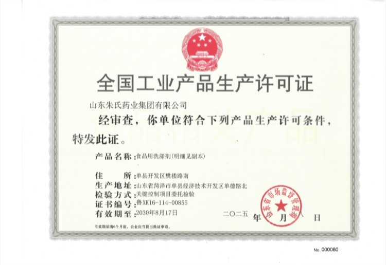 喜訊!山東朱氏藥業(yè)集團(tuán)獲食品用洗滌劑生產(chǎn)許可證!
