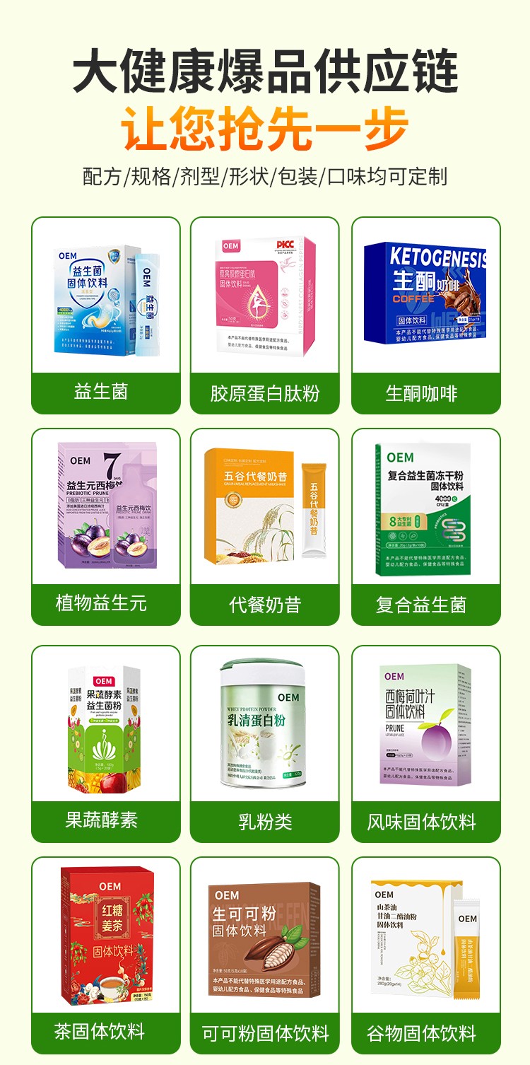 OEM模式:品牌方僅需提供品牌標(biāo)識,集團負責(zé)配方優(yōu)化、生產(chǎn)質(zhì)檢及資質(zhì)申報。例如,某區(qū)域健康品牌通過OEM合作推出定制茶飲,集團根據(jù)其門店分布調(diào)整產(chǎn)品規(guī)格,設(shè)計便攜鋁罐裝與家庭濃縮液條包,滿足不同消費場景需求。