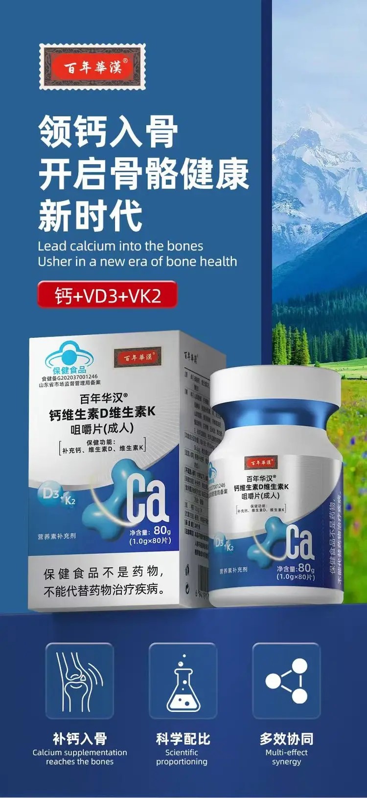 百年華漢鈣維生素D維生素K咀嚼片通過科學(xué)配比與便捷劑型設(shè)計,為現(xiàn)代人提供了高效、靈活的補鈣方案,尤其適合快節(jié)奏生活下的骨骼健康管理。以下從產(chǎn)品特點、作用機制、適用人群及使用建議四方面展開分析: