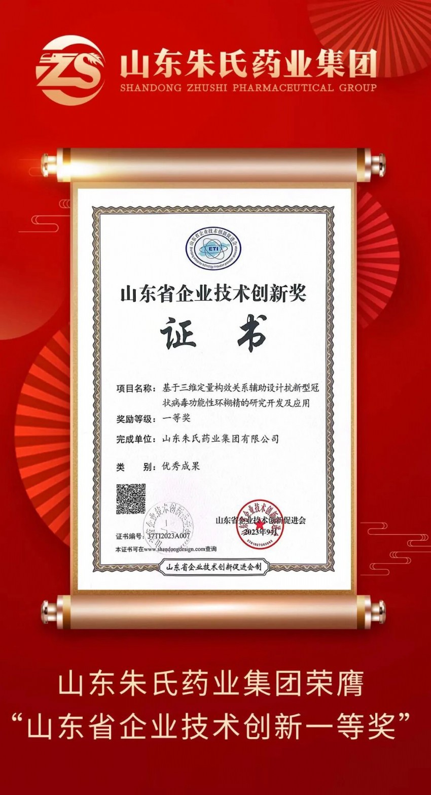 山東朱氏藥業(yè)集團榮獲菏澤市科學(xué)技術(shù)進步獎一等獎!