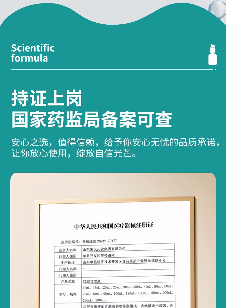 朱氏藥業(yè)持有二類醫(yī)療器械生產(chǎn)許可證,其口腔含漱液已通過國家藥監(jiān)局審批,獲得《中華人民共和國醫(yī)療器械注冊證》(魯械注準(zhǔn)20242170477),符合醫(yī)療器械生產(chǎn)質(zhì)量管理規(guī)范(GMP)。從原料采購到成品出廠,全程遵循嚴(yán)格標(biāo)準(zhǔn),確保產(chǎn)品**性與批次穩(wěn)定性。