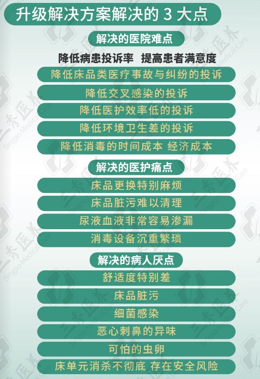 ① 升級(jí)產(chǎn)品功能,提升產(chǎn)品“三防一隔”(防血液、防尿液、防臟污、隔離)性能,避免液體污染、滲漏,影響衛(wèi)生環(huán)境,減少細(xì)菌、螨蟲(chóng)滋生。