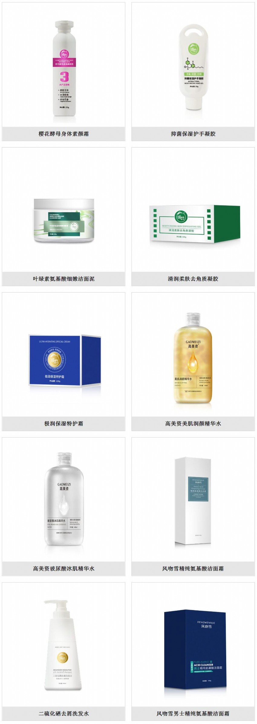 公司擁有妝/消/械、嬰童類產品的生產許可,提供OEM/ODM/OBM一站式服務,F(xiàn)擁有三精制藥口腔護理系列、*愛衛(wèi)生巾系列、韓貝純紙尿褲成人褲系列、美后潔面巾系列、茂純抗衰高端院線系列、櫻之夏抗敏保濕系列、防曬系列、逸芳美白祛斑系列、繽竹養(yǎng)生系列,柔麗娜抑菌系列等。涉及醫(yī)藥連鎖、商業(yè)貿易、美容院線、日化零售、網絡銷售海外貿易等多個市場領域。