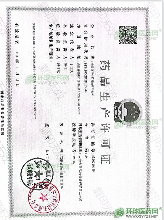 發(fā)證機(jī)關(guān): 安徽省藥品監(jiān)督管理局