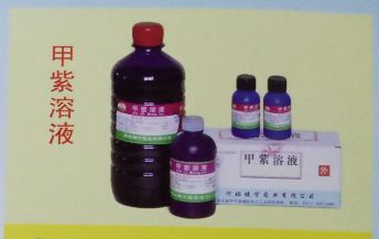 甲紫溶液遇酸呈綠黃色,遇堿游離出甲紫鹽基的褐紫色沉淀。