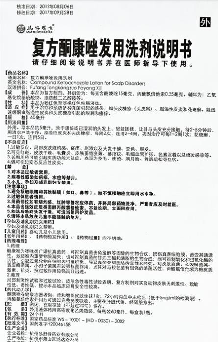 西藥、OTC乙類(lèi),非醫(yī)保。用于頭皮糠疹(頭皮屑)、局部性花斑癬、脂溢性皮炎。有西安楊森制藥有限公司、南京白敬宇制藥有限責(zé)任公司生產(chǎn)。目前均在環(huán)球醫(yī)藥網(wǎng)招商。