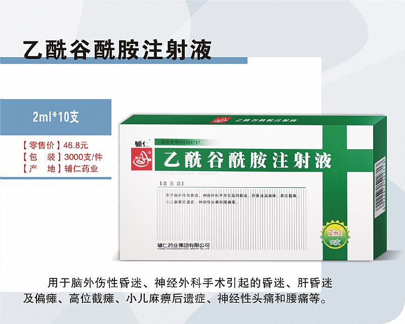 本品在體內(nèi)分布廣泛,在腦、肝和腎中濃度較高,能透過血-腦脊液屏障。在腎小管細(xì)胞內(nèi)分解出氨而變成乙酰谷氨酸。氨經(jīng)腎小管分泌排出,乙酰谷氨酸被吸收,參與體內(nèi)代謝。