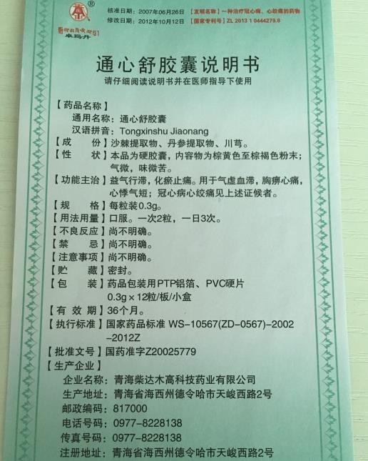 中成藥、處方藥、醫(yī)保乙類。益氣行滯,化瘀止痛。用于氣虛血滯,胸痹心痛,心悸氣短;冠心病心絞痛見(jiàn)上述證候者。由青海柴達(dá)木高科技藥業(yè)有限公司生產(chǎn),目前在環(huán)球醫(yī)藥網(wǎng)招商,批準(zhǔn)文號(hào):國(guó)藥準(zhǔn)字Z20025779。【藥品名稱】通用名稱:通心舒膠囊