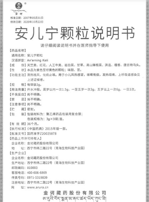 中成藥,處方藥、醫(yī)保乙類。用于小兒風(fēng)熱感冒,咳嗽有痰,發(fā)熱咽痛,上呼吸道感染見上述證候者。由金訶藏藥股份有限公司生產(chǎn),批準(zhǔn)文號:國藥準(zhǔn)字Z20025878。安兒寧顆粒目前在環(huán)球醫(yī)藥網(wǎng)招商。【藥品名稱】