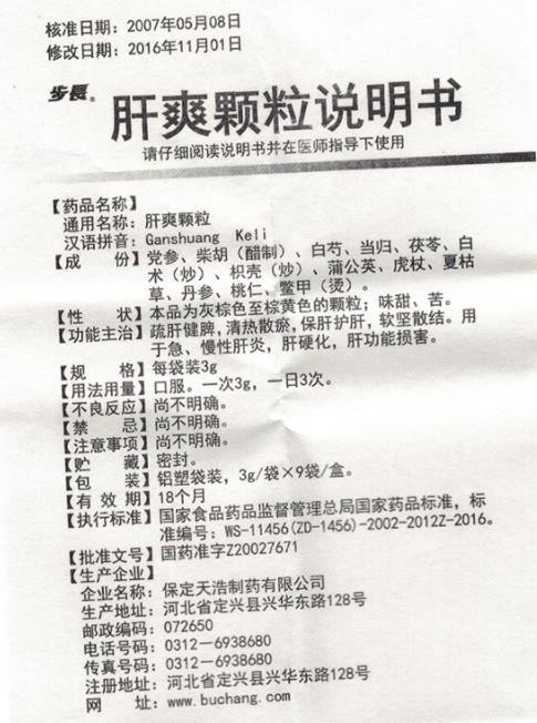 - 本頁面信息僅供參考,請以產(chǎn)品實際附帶說明書為準。 步長肝爽顆粒 外包裝 步長肝爽顆粒保定天浩制藥說明書(2016版)