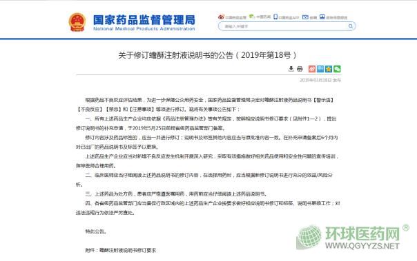 - 3月18日,國家藥監(jiān)局公告稱,決定對蟾酥 注射液 藥品說明書【警示語】【不良反應(yīng)】【禁忌】和【注意事項】等項進行修訂。 具體如下