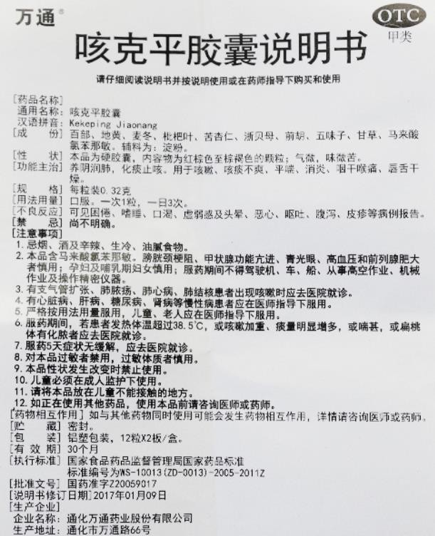 - 本頁面信息僅供參考,請以產(chǎn)品實際附帶說明書為準。 萬通牌咳克平膠囊 外包裝 萬通牌咳克平膠囊 說明書