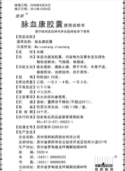 - 本頁面信息僅供參考,請以產(chǎn)品實際附帶說明書為準。 信邦 脈血康膠囊 說明書圖片版 信邦 脈血康膠囊 說明書文字版 核準日期