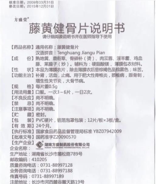 中成藥、處方藥、醫(yī)保乙類。補(bǔ)腎,活血,止痛。用于肥大性脊椎炎,頸椎病,跟骨刺,增生性關(guān)節(jié)炎,大骨節(jié)病。由湖南方盛制藥股份有限公司生產(chǎn)。目前在環(huán)球醫(yī)藥網(wǎng)招商。【藥品名稱】通用名稱:藤黃健骨片
