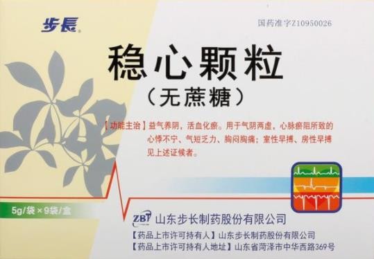中成藥、處方藥、醫(yī)保乙類(lèi)。益氣養(yǎng)陰,定悸復(fù)脈,活血化瘀。主治氣陰兩虛兼心脈淤阻所致的心悸不寧、氣短乏力、頭暈心悸、胸悶胸痛,適用于心律失常,室性早搏,房性早搏等屬上述證候者。山東步長(zhǎng)制藥股份有限公司生產(chǎn)。【藥品名稱(chēng)】通用名稱(chēng):穩(wěn)心顆粒