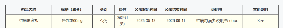 - 2023年05月15日,國(guó)家不良反應(yīng)監(jiān)測(cè)中心發(fā)布 抗病毒 滴丸轉(zhuǎn)換為非 處方藥 公示,公示期為2023.05.12至2023.06.11。 公告主要內(nèi)容
