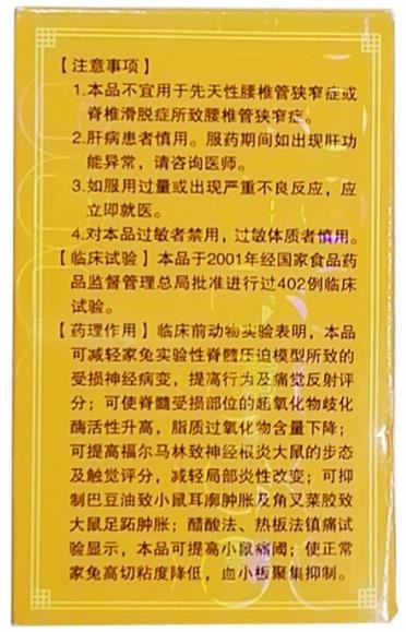 【注意事項(xiàng)】本品不宜用于先天性腰椎管狹窄癥或脊椎滑脫癥所致腰椎管狹窄癥。肝病患者慎用。服藥期間如出現(xiàn)肝功能異常,請(qǐng)咨詢醫(yī)師。如服用過量或出現(xiàn)嚴(yán)重不良反應(yīng),應(yīng)立即就醫(yī)。對(duì)本品過敏者禁用,過敏體質(zhì)者慎用。