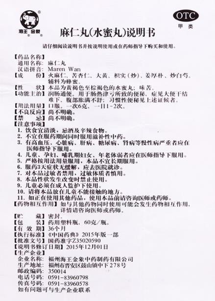 - 本頁(yè)面信息僅供參考,請(qǐng)以產(chǎn)品實(shí)際附帶說明書為準(zhǔn)。 海王 麻仁丸 說明書文字版 見以下圖片版 海王 麻仁丸 說明書圖片版