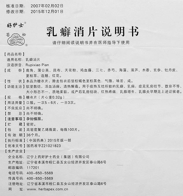 - 遼寧好護士(蒼松)乳癖消片說明書