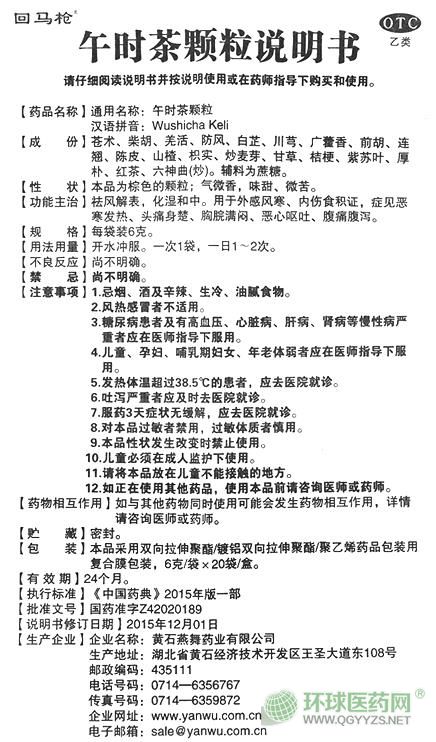 - 本頁面信息僅供參考,請以產(chǎn)品實際附帶說明書為準(zhǔn)。 回馬槍 午時茶顆粒 說明書文字版 【藥品名稱】通用名稱:午時茶顆粒 漢語拼音